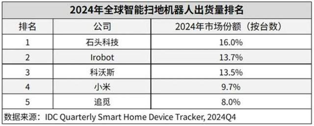 IDC数据显示,2024年追觅在全球扫地机器人市场的份额为8%,排名第四,落后于石头科技的16%。