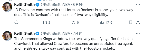 22岁的JD-戴维森此前被凯尔特人裁掉,如今他与火箭签下一年双向合同,这是戴维森拥有双向合同资格的最后一个赛季;23岁的以赛亚-克劳福德也和火箭签下双向合同,此前国王撤销他的双向资格报价,因此他以自由球员身份加盟火箭。