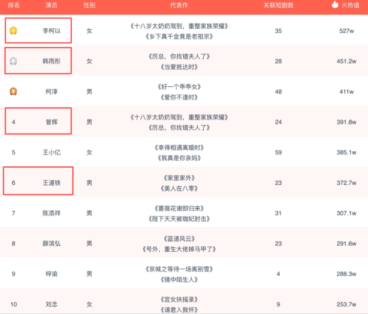 如在剧查查的《8月短剧演员榜》中,李柯以、韩雨彤、曾辉、王道铁均排在前十,他们分别位列第一、第二、第四和第六,而这些演员全都是听花岛旗下的签约艺人。与此同时,姜十七、赵佳、邓灵枢、王培延等签约演员,在业内亦是有着不俗的人气与作品积累。听花岛的短剧艺人矩阵堪称豪华,说得更夸张一点,甚至可以用“几近拿下头部阵容的半壁江山”来形容。