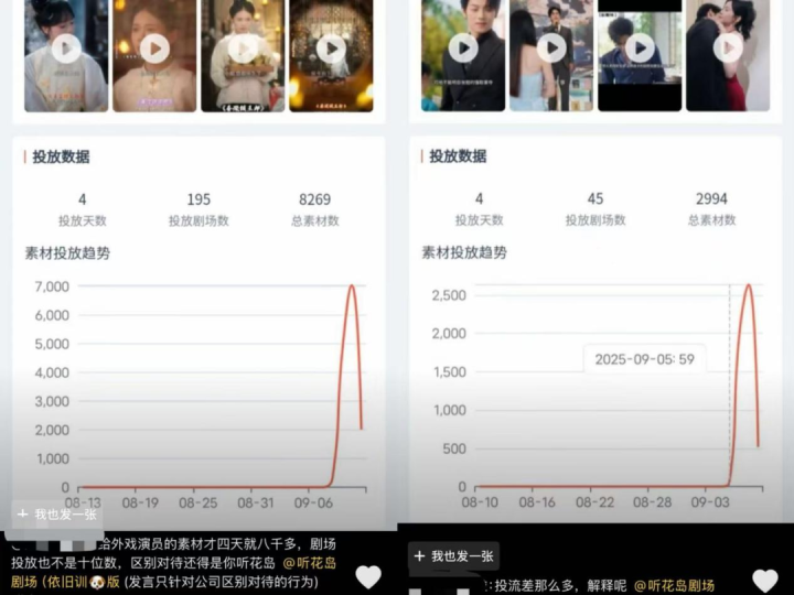 对此,有粉丝对比了听花岛短剧厂牌旗下的相关作品,发现听花岛的剧宣很多(投流猛在各大社交平台上,已经是听花岛公认的标签了),对“皇太女”李柯以的偏爱毫不掩饰,“《臣服她》素材投流差那么多就知道了,韩雨彤的女主剧去搜投流素材,和《臣服她》一样才两千多,是同一家公司,为什么别的同公司的剧素材投流就不一样?几万几万的投啊,剧场投放几百个,红果推荐榜上,同公司的其他演员的剧是有位置的,看见没有,钱在哪里,爱就在哪里。我们就是他们回本赚流量、帮别人飞升的工具罢了,别老给翻拍本测试观众容忍度、粉丝黏度,小心下次观众掀桌不买贵司的账。”